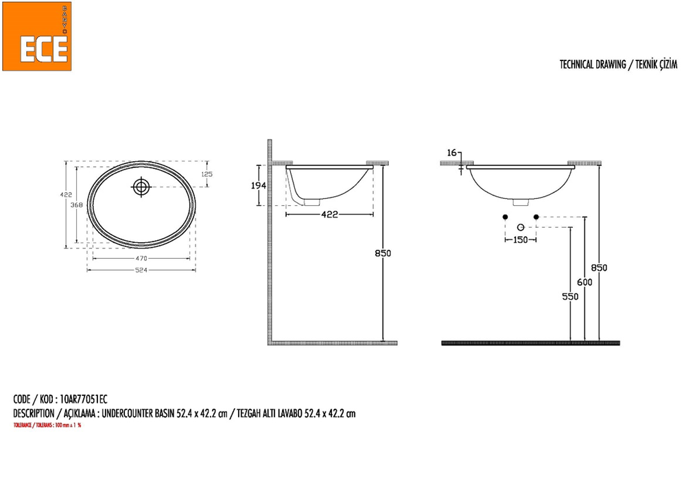 Ece Tezgah Altı Lavabo 52,4 X 42,2 / Renk Beyaz.